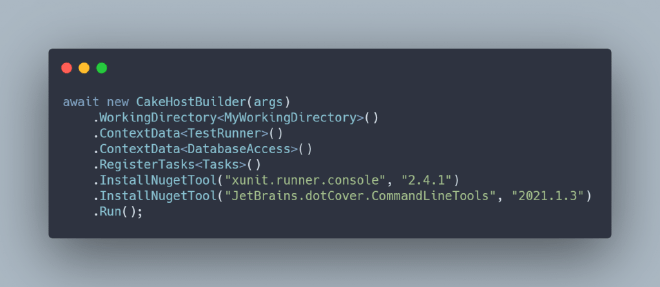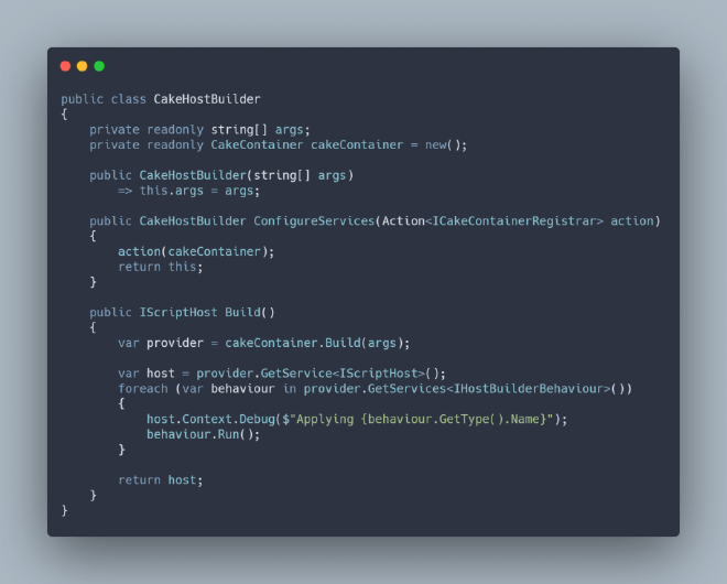 I still needed one thing, the installation of tools. I then added 2 things, a way to register stuff into the ICakeContainerRegistrar and a special interface IHostBuilderBehaviour that executes a Run() method before returning the IScriptHost, to add functionality into Cake.Console. What I got was a very simple CakeHostBuilder that I can then extend via extension methods.