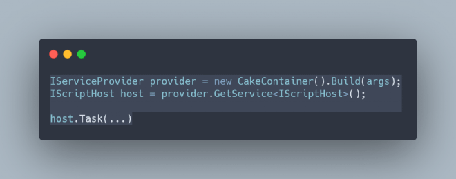 Cake has an architecture where every piece of functionality is behind an interface and is injected into objects as needed. Then the registering of interfaces into implementations is defined in “Modules”. There is a ICakeContainerRegistrar Object that can receive registrations. I needed to implement a registrar if I wanted to take advantage of internal implementations of interfaces from Cake. So I did create a CakeContainer that can receive registrations from Cake.Core and Cake.Nuget modules and then create an IServiceProvider that can instantiate the needed parts of cake.