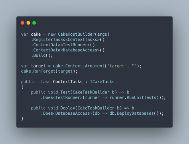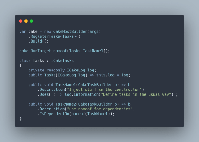 This was the best option, but I really didn’t like a couple of things like, the ceremony of writing a class for each task or using attributes for describing tasks instead of the fluent syntax of cake scripts - Cake.Bridge