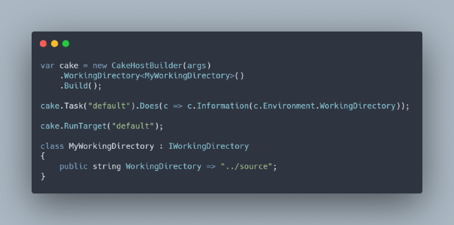 I found myself hating that part of the script that reads the “target” from the arguments. It just breaks the fluent vibe from the code! So I extended the CakeHostBuilder to have a Run method that simply reads the target from the arguments and runs it. Putting it all together…