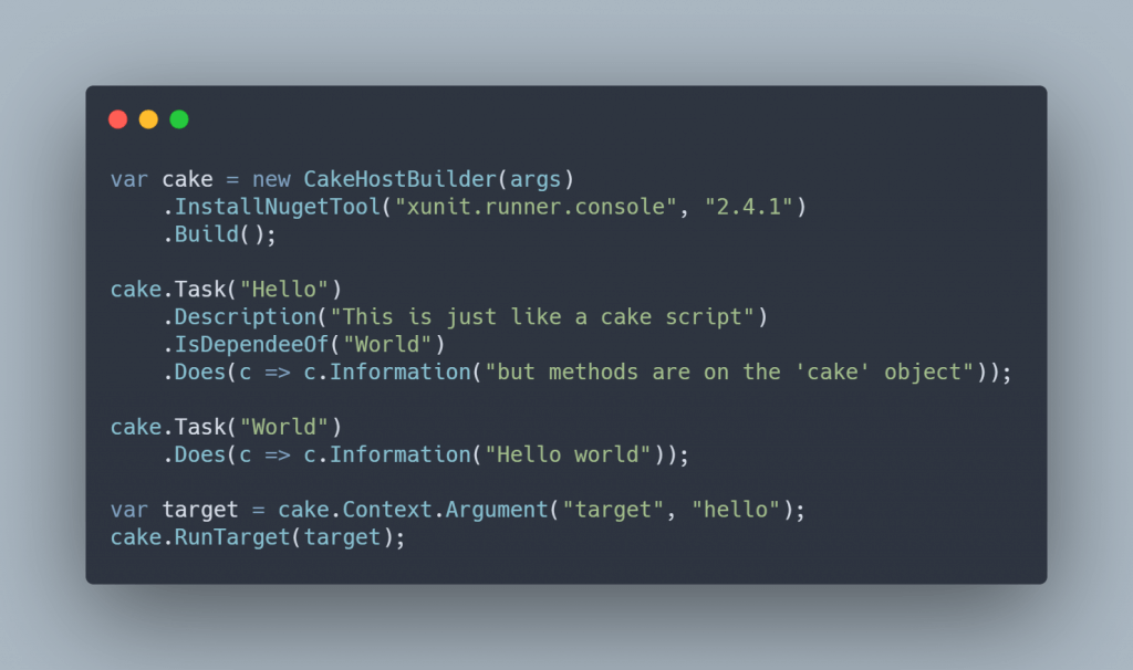 I found myself hating that part of the script that reads the “target” from the arguments. It just breaks the fluent vibe from the code! So I extended the CakeHostBuilder to have a Run method that simply reads the target from the arguments and runs it. Putting it all together…