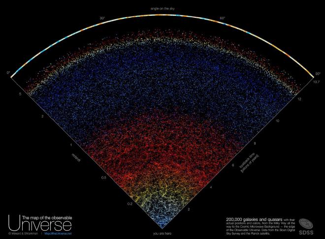 This map shows a slice of our Universe. It was created from astronomical data taken night after night over a period of 15 years using a telescope in New Mexico, USA. We are located at the bottom. At the top is the actual edge of the observable Universe. In between, we see about 200,000 galaxies.