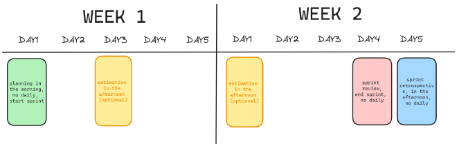 On the first day of the sprint, one should do the planning. Not that the planning has not been thought about until then, but it’s the time where the team gets together to agree upon the sprint’s scope and goals. In this day there is no need to have a daily meeting.